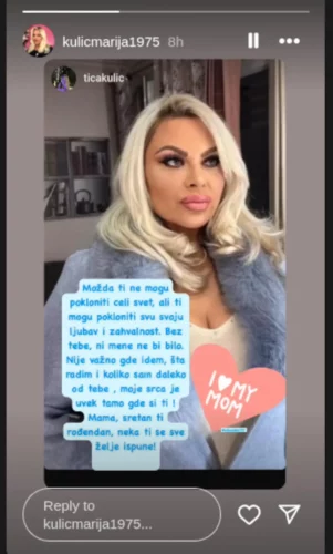 – Možda ti ne mogu pokloniti celi svet, ali ti mogu pokloniti svu svoju ljubav i zahvalnost. Bez tebe, ni mene ne bi bilo. Nije važno gde idem, šta radim i koliko sam daleko od tebe, moje srce je uvek tamo gde si ti! Mama, sretan ti rođendan, neka ti se sve želje ispune – pisalo je na Instagram storiju.