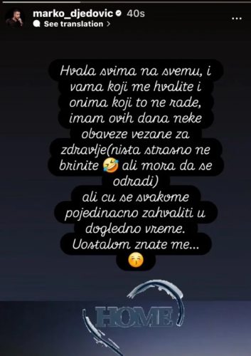 – Hvala svima na svemu, i vama koji me hvalite i onima koji to ne rade. Imam ovih dana neke obaveze vezane za zdravlje (ništa strašno, ne brinite) ali mora da se odradi, ali ću svakome pojedinačno zahvaliti u dogledno vreme. Uostalom, znate me – napisao je Marko na svom Instagram profilu.