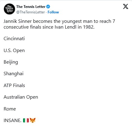 On je tako postao najmlađi teniser koji je sa 22 godine stigao do sedam vezanih finala. Pre njega je to učinio Ivan Lendl 1982. godine.