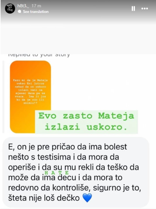 Prema navodima koji se šire društvenim mrežama, Mateja se navodno poverio svojoj bivšoj devojci Eni Čolić da će biti odsutan iz rijalitija na mesec dana, nakon čega će se vratiti.