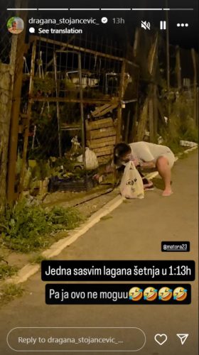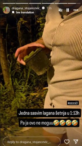 – Jedna sasvim lagana šetnja u 01:13h. Pa, ja ovo ne mogu -napisala je Dragana na storiju uz emotikone koji plaču od smeha.