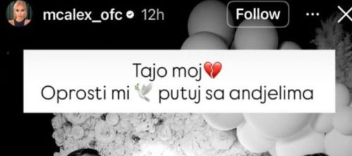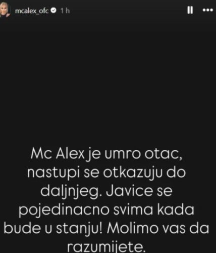 – Mc Alex je umro otac, nastupi se otkaszuju do daljnjeg. Javiće se pojedinačno svima kada bude u stanju. Molimo vas da razumete – glasilo je saopštenje koje je Aleks objavila, a u sledećim objavala se oprostila od oca.