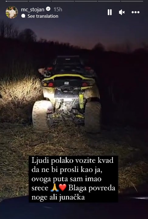 Reper i pevač, Marko Stojković poznatiji kao MC Stojan, doživeo je nezgodu na kvadu. Naime, MC Stojan je objavio na svom Instagram profilu kako je sa kvadom upao u blato i doživeo nezgodu u kojoj je zadobio povredu noge.