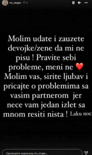 On važi za zgodnog i šarmantnog momka, te nije čudno da se dopada mnogim devojkama. Očekivano ili ne, među pripadnicama nežnijeg pola ima i onih koje su zauzete, a baš njima se Stojan obratio porukom koja je mnoge nasmejala, ali i iznenadila.