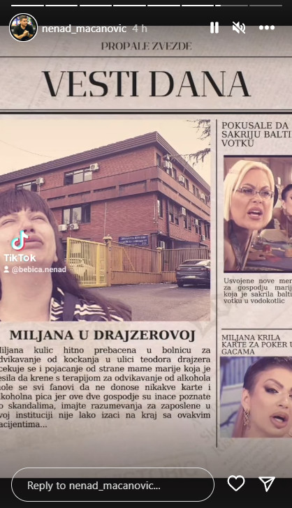 – „Miljana Kulić hitno je prebačena u bolnicu za odvikavanje od kockanja u ulici Teodora Drajzera. Očekuje se i pojačanje od strane mame Marije koja treba da počne sa terapijom za odvikavanje od alkohola“, pisalo je između ostalog.