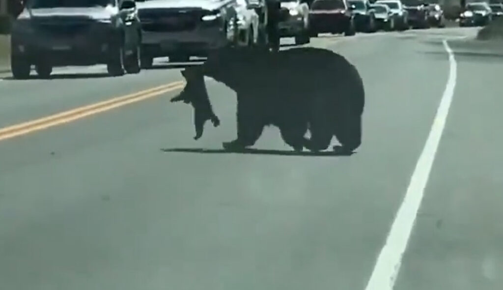 A mama bear carries her cubs across the road. pic.twitter.com/gA4OFTPz1i