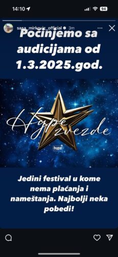 – Počinjemo sa audicijama od 01.03.2025. godine. Jedini festival u kome nema plaćanja i nameštanja. Najbolji neka pobedi! -napisao je Saša na svom instagram nalogu.