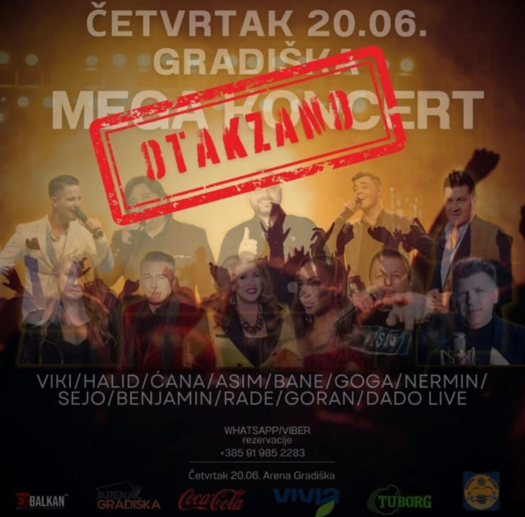 “Mega koncert” koji je dugo najavljivan u Areni Gradiška za 20. jun 2024, je otkazan, stoji u saopštenju na društvenoj mreži Instagram Zorana Boroje.