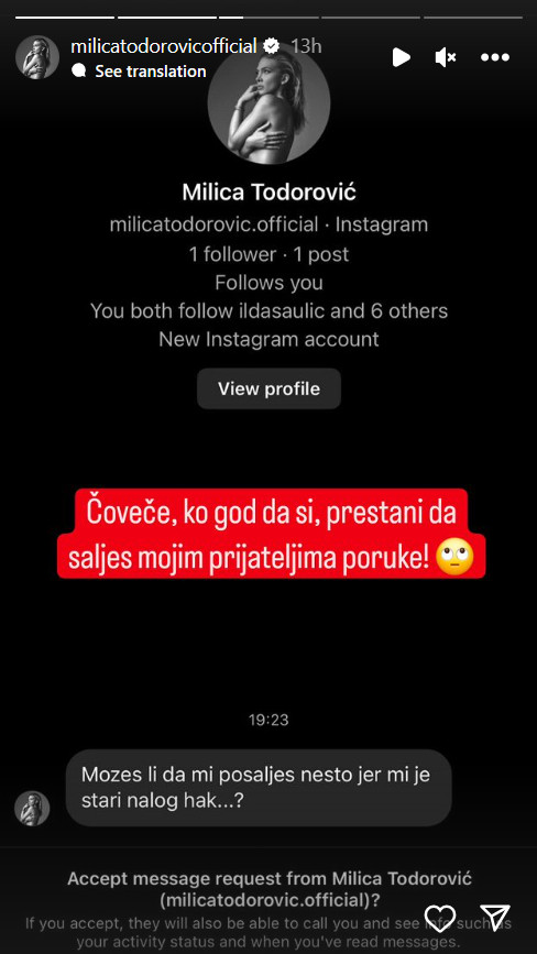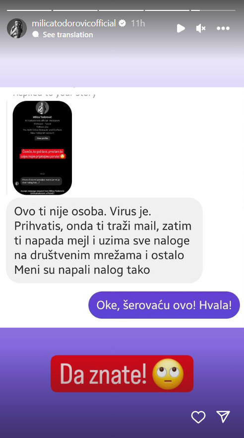 Na priloženoj slici četa, osoba tvrdi da je zvanični profil Milice Todorović i izjavljuje da je njen pravi nalog hakovan. Izrevoltirana pevačica uputila je jasnu poruku napadaču: „Čoveče, ko god da si, prestani da šalješ poruke mojim prijateljima.“