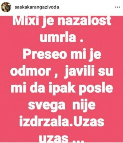 – U pitanju je pas moje komšinice u Beogradu. Pas se zove Miksi. Nisam mislila na Miljanu Kulić, ne daj Bože. Njoj bih poručila da izdrži – rekla je Saška za Informer.