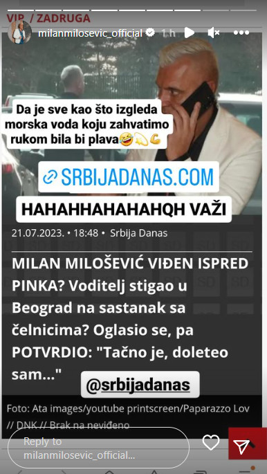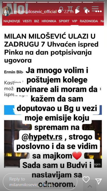 – Ja mnogo volim i poštujem kolege novinare, ali moram da kažem da sam doputovao u Beograd u vezi moje emisije koju spremam na Hype televiziji, strogo poslovno i da se vidim sa majkom. Sada sam u Budvi i nastavljam sa odmorom – napisao je Milan na svom Instagram profilu.