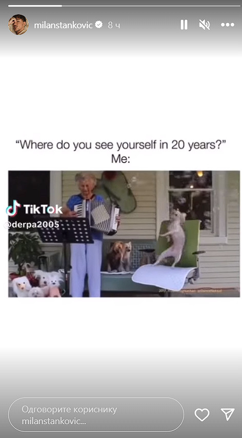 Milan Stanković se oglasio i otkrio ISTINUNaime, u videu zanimljivog naslova ‘Kako vidim sebe za 20 godina’, pojavljuje se pas koji pleše dok starija gospođa pored njega svira harmoniku.