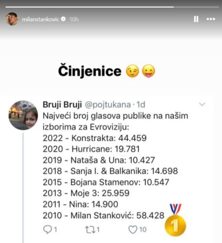 Pesmom „Ovo je Balkan“ mnoge je zaludeo, ali je bilo i mnošto negativnih komentara, što je gotovo uvek i slučaj. Milan je sada objavio listu koja navodno pokazuje najveći broj glasova publike proteklih godina.