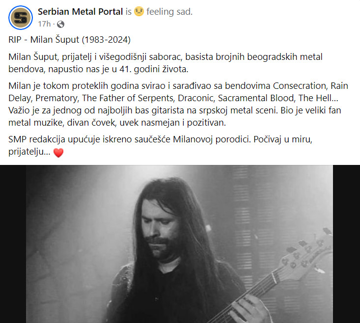 „Milan Šuput, prijatelj i višegodišnji saborac, basista brojnih beogradskih metal bendova, napustio nas je u 41. godini života.