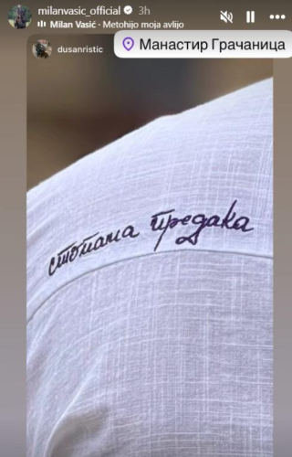 Za ovu posebnu priliku, Milan je nosio košulju sa izvezenim natpisom „Stopama predaka“, čime je simbolično ukazao na poštovanje porodične i duhovne tradicije.