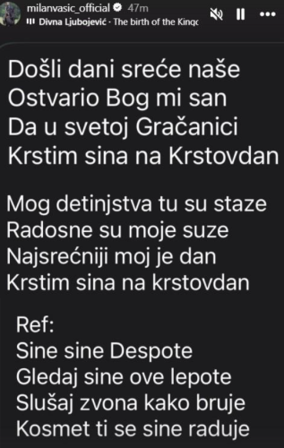 – Došli dani sreće naše, ostvario Bog mi san. Da u svetoj Gračanici krstim sina na Krstovdan. Mog detinjstva tu su staze, radosne su moje suze. Najsrećniji moj je dan, krstim sina na Krstovdan. Sine, sine, Despote, gledaj sine ove lepote. Slušaj zvona kako bruje, Kosmet ti se sine raduje – stoji u objavi koju je podelio Milan Vasić.