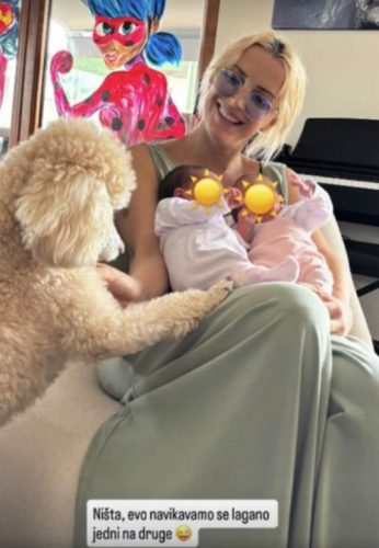 Milena je na Instagramu podelila emotivnu fotografiju na kojoj sedi sa bliznakinjama u naručju, dok se pored njih nalazi i porodični ljubimac – pudlica, koja znatiželjno posmatra nove članove porodice.