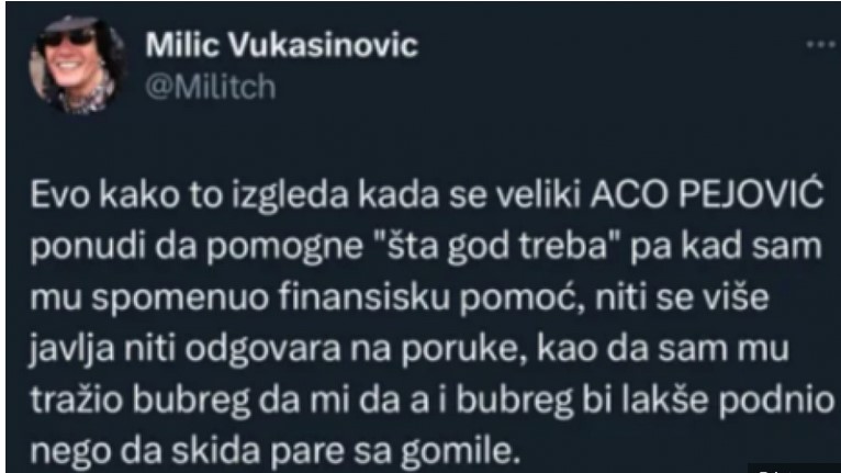 – Evo kako to izgleda kad se veliki Aco Pejović ponudi da pomogne “šta god treba“, pa kad sam mu spomenuo finansijsku pomoć, niti se više javlja, niti odgovara na poruke, kao da sam mu tražio bubreg da mi da, a i bubreg bi lakše podneo, nego da skida pare s gomile – otkrio je Milić na svom profilu na duruštvenoj mreži X.