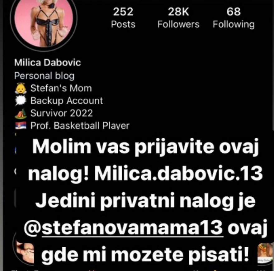 – Molim vas, prijavite ovaj nalog! Moj jedini profil, privatni je ovaj – napisala je Milica Dabović na Instagramu.