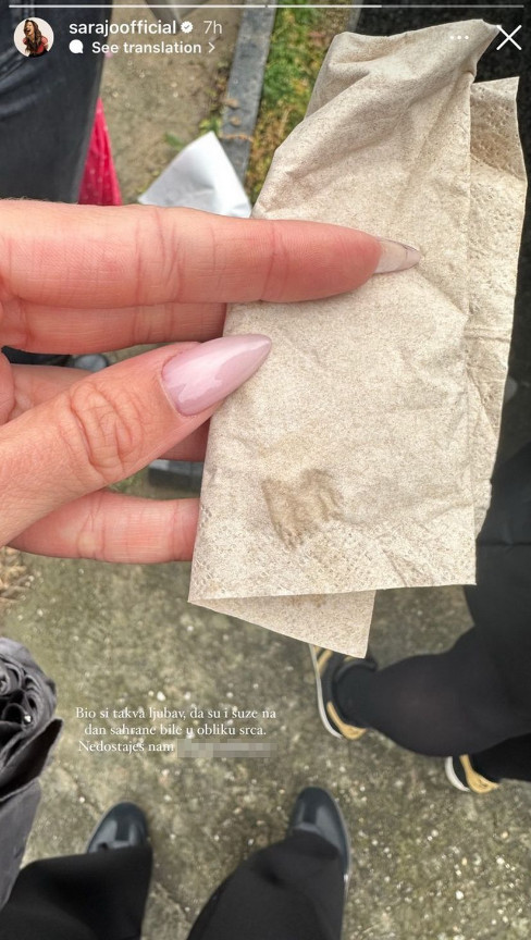 Naime, pevačica je postavila sliku sa sahrane. Na kojoj je maramica sa suzom u obliku srca. Uz emotivnu poruku: „Bio si takva ljubav, da su i suze na dan sahrane bile u obliku srca. Nedostaješ nam.“
