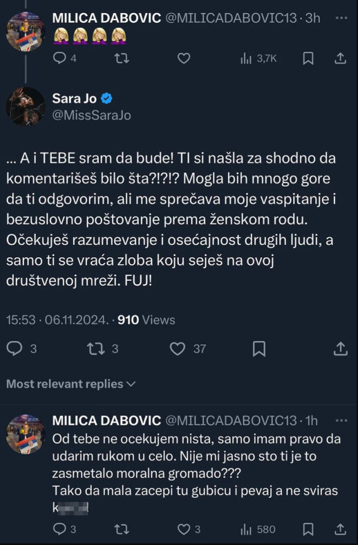 Ova objava izazvala je brojne reakcije. Među kojima je bio i komentar Milice Dabović koja je postavila emotikone „lupanje u glavu“. Na šta je Sara Jovanović odgovorila uvredama, te Milica nije ostala imuna na provokacije i odgovorila je brutalno.