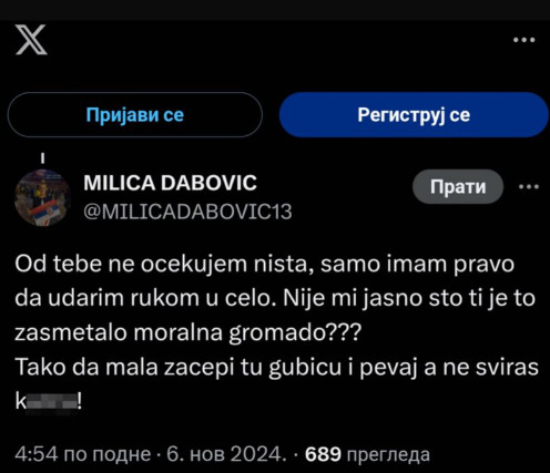 Milica je dalje istakla da nije neko ko širi zlobu, kako je Sara navela, i da je uvek stajala u zaštitu ljudi kada su napadani na mrežama, ali da ne može da shvati kako je neko mogao biti „toliko uvređen“ njenim komentarom.