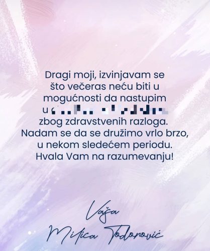 – Dragi moji, izvinjavam se što večeras neću biti u mogućnosti da nastupim večeras zbog zdravstvenih razloga. Nadam se da se družimo vrlo brzo u nekom sledećem periodu. Hvala vam na razumevanju – napisala je pevačica.