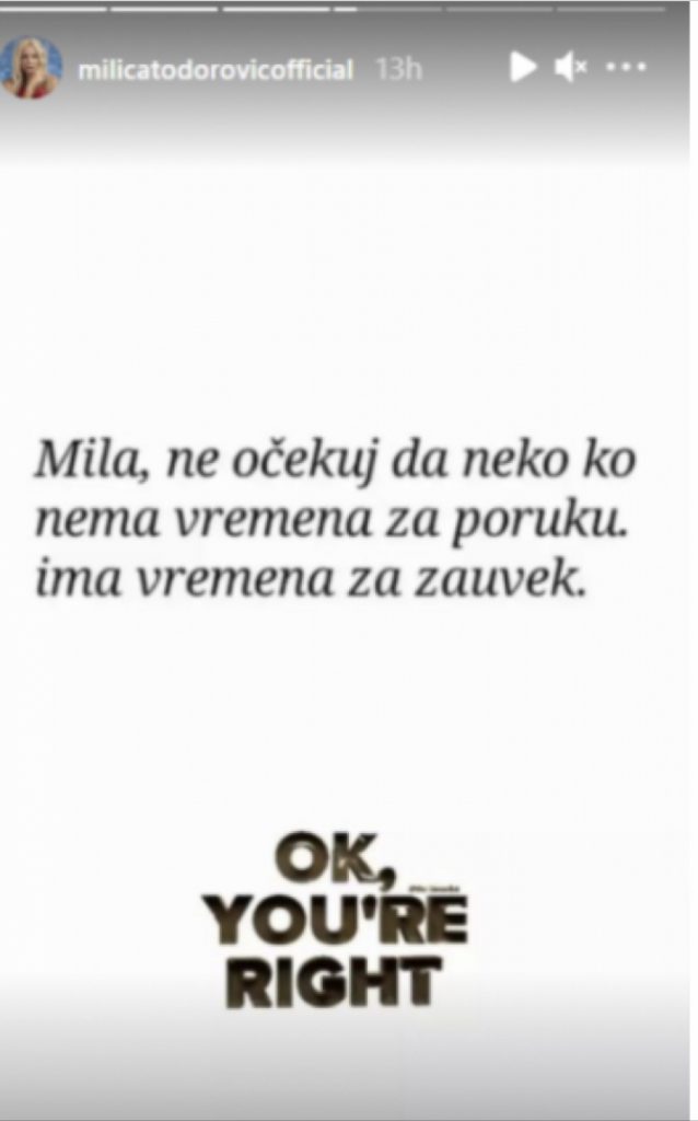 Da se Milica slaže sa tekstom koji je podelila svedoči činjenica da je na istoj fotografiji napisala ,,Ok, u pravu si„. Da li je to pevačica naišla na neko razočarenje od strane muškog roda, o čemu se redovno šali na svoj račun, ostaje nam samo da vidimo.