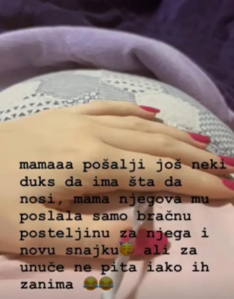 – Mamaaa pošalji još neki duks da ima šta da nosi, mama njegova mu poslala samo bračnu posteljinu za njega i novu snajku, ali za unuče ne pita, iako ih zanima – napisala je Veličkovićeva u svojoj objavi.