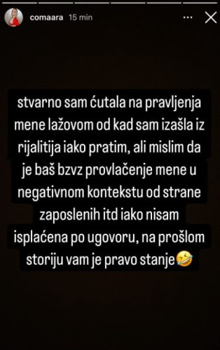 – Stvarno sam ćutala na pravljena mene lažovom od kad sam izašla iz rijalitija iako pratim, ali mislim da je baš bezveze provljačenje mene u negativnom kontekstu od stane zaposlenih iako nisam isplaćena po ugovoru, na prošlom storiju van je pravo stanje.