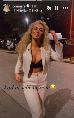 Beli sako i bele pantalone istakle su njen preplanuli ten, a kratki crni topić istakao je njene bujne grudi, koje su posle porođaja u prvom planu. Dok je kosu pustila da joj se vijori onako uvijeno, kakva joj je zapravo prirodna. U okviru fotografije je stavila pesmu Nikolije Jovanović – „O bivšima“, a svi misle da ju je posvetila bivšem partneru Terzi.