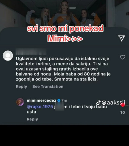 – Uglavnom ljudi pokušavaju da istaknu svoje kvalitete i vrline, a mane da sakriju. Ti si na ovaj užasan stajling gratis izbacila ove balvane od nogu. Moja baba od 80 godina je zgodnija od tebe. Sramota na šta ličiš – glasio je jedan komentar ispod objave Mimi.