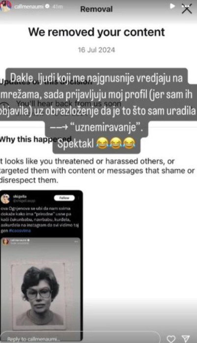 – Dakle, ljudi koji me najgnusnije vređaju na mrežama sada prijavljuju moj profil (jer sam ih objavila) uz obrazloženje da je to što sam uradila „uznemiravanje“. Spektakl.