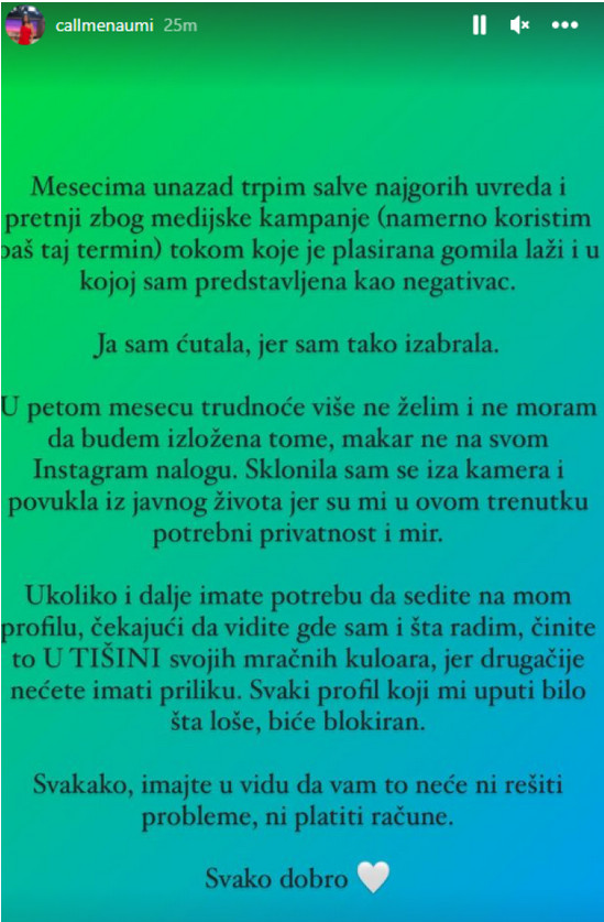 – Mesecima unazad trpim salve najgorih uvreda i pretnji zbog medijske kampanje (namerno koristim bas taj termin) tokom koje je plasirana gomila laži i u kojoj sam predstavljena kao negativac. Ćutala sam, jer sam tako izabrala. U petom mesecu trudnoće, više ne želim i ne moram da budem izložena tome, makar ne na svom Instagram nalogu. Sklonila sam se iza kamera i povukla iz javnog života jer su mi u ovom trenutku potrebni privatnost i mir – napisala je ona, dodajući da će blokirati sve one koji je budu uznemiravali: