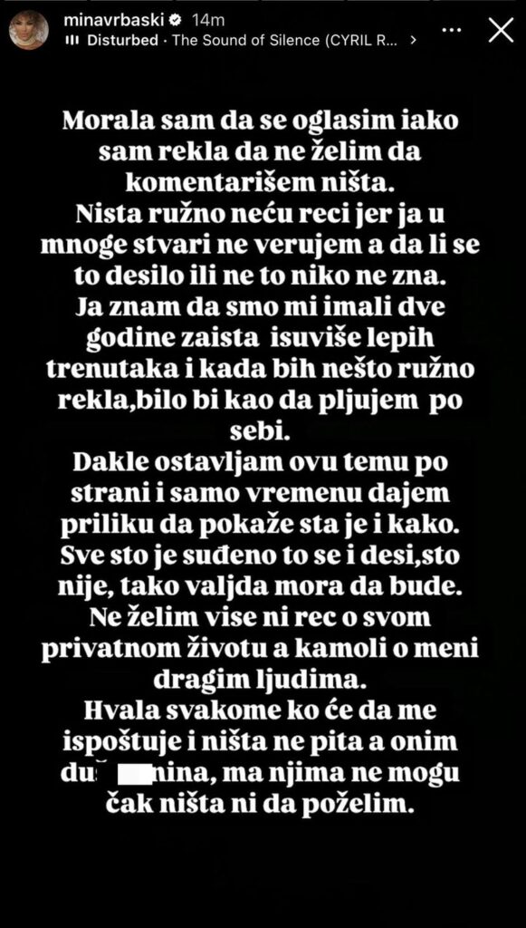 – Hvala svakome ko će da me ispoštuje i ništa ne pita, a onim dušmanima, ma njima ne mogu čak ništa ni da poželim – napisala je Mina Vrbaški u priči na Instagramu.