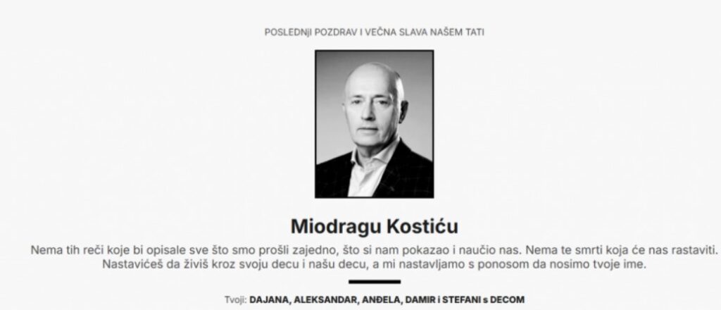 – Nema tih reči koje bi opisale sve što smo prošli zajedno, što si nam pokazao i naučio nas. Nema te smrti koja će nas rastaviti. Nastavićeš da živiš kroz svoju decu i našu decu, a mi nastavljamo s ponosom da nosimo tvoje ime – stoji u čitulji posvećenoj Miodragu Kostiću koje su danas objavile Novosti, a koju potpisuju Dajana, Aleksandar, Anđela, Damir i Stefani.