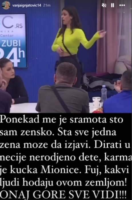 – Ponekad me je sramota što sam žensko. Šta sve jedna žena može da izgovori. Dirati nečije nerođeno dete, karma je kučka, Mionice. Fuj, kakvi ljudi hodaju ovom zemljom. Onaj gore vidi sve – napisala je besna Vanja Ignjatović, koja se tek nedavno razvela od Ša.