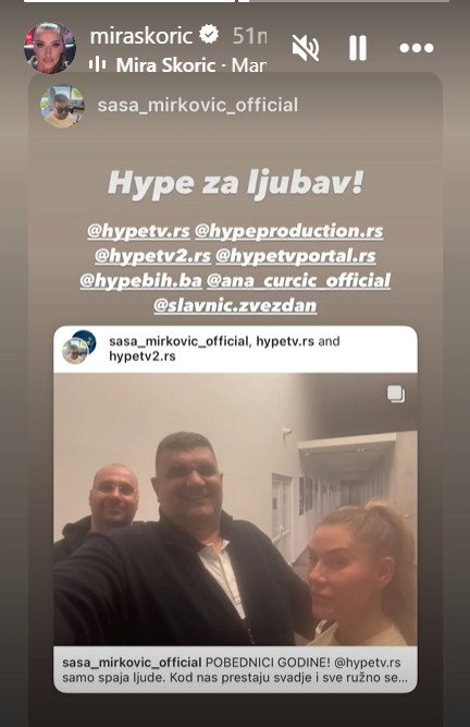 Podršku pomirenju pružila je takođe i Mira Škorić. Pevačica je svom Instagram storiju podelila je fotografiju na kojoj se Saša Mirković nalazi sa Anom i Zvezdanom, te javno podržala „Hype za ljubav!“.