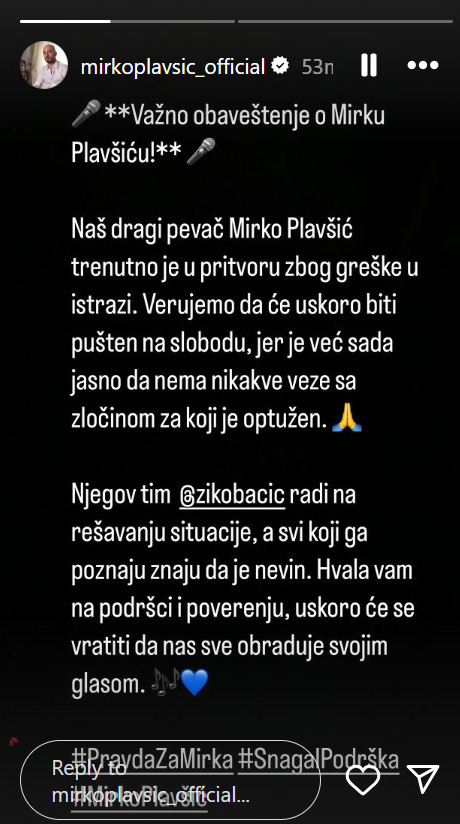 „Naš dragi pevač Mirko Plavšić trenutno je u pritvoru zbog greške u istrazi. Verujemo da će uskoro biti pušten na slobodu, jer je već sada jasno da nema nikakve veze sa zločinom za koji je optužen“, piše u saopštenju.