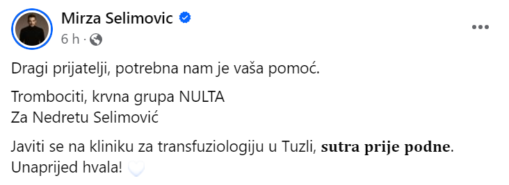 – Dragi prijatelji, potrebna nam je vaša pomoć. Trombociti, krvna grupa nulta, za Nedretu Selimović. Javiti se na kliniku za transfuziologiju u Tuzli, sutra pre podne. Hvala vam – napisao je pevač putem svog Instagram profila.