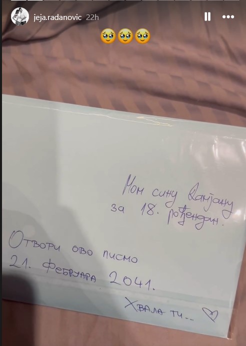 „Mom sinu Damjanu za 18. rođendan. Otvori ovo pismo 21. februara 2041. godine. Hvala ti. Od tate Slobodana – piše na koverti čiji sadržaj još uvek nije poznat.
