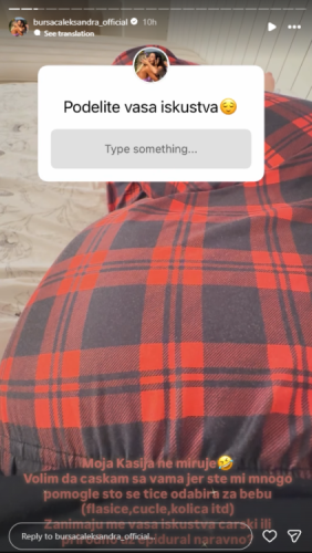 Na objavljenoj slici Aleksandra je pozirala na krevetu, a njen trudnički stomak bio je u prvom planu. U opisu je otkrila i da se sve više povezuje sa svojim pratiocima, koji joj pomažu savetima o majčinstvu.