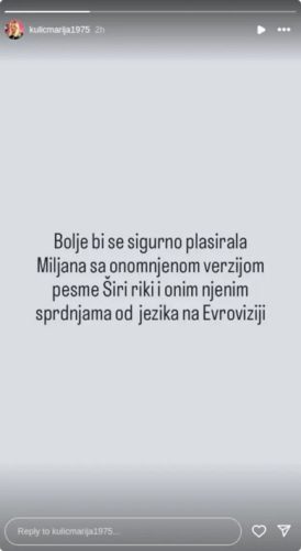 – Bolje bi se sigurno plasirala Miljana, sa onom njenom verzijom pesme „Širi riki“ i onim njenim sprdnjama od jezika na Evroviziji – napisala je Marija, aludirajući na Miljanine kontroverzne nastupe koji su stekli veliku popularnost tokom njenih rijaliti dana.