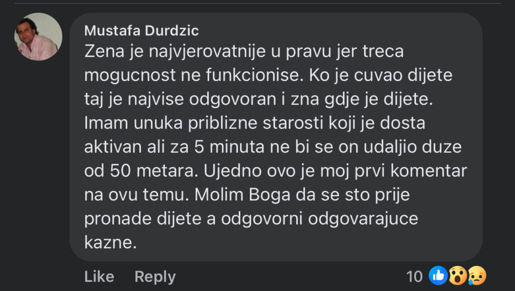 “Mogućnost ne funkcioniše. Ko je čuvao dete taj je najviše odgovoran i zna gde je dete. Imam unuka približne starosti koji je dosta aktivan. Ali za 5 minuta ne bi se on udaljio dalje od 50 metara.Ujedno ovo je moj prvi komentar na ovu temu. Molim Boga da se što pre pronađe dete a odgovornima odgovarajuće kazne.”napisao je Mustafa.