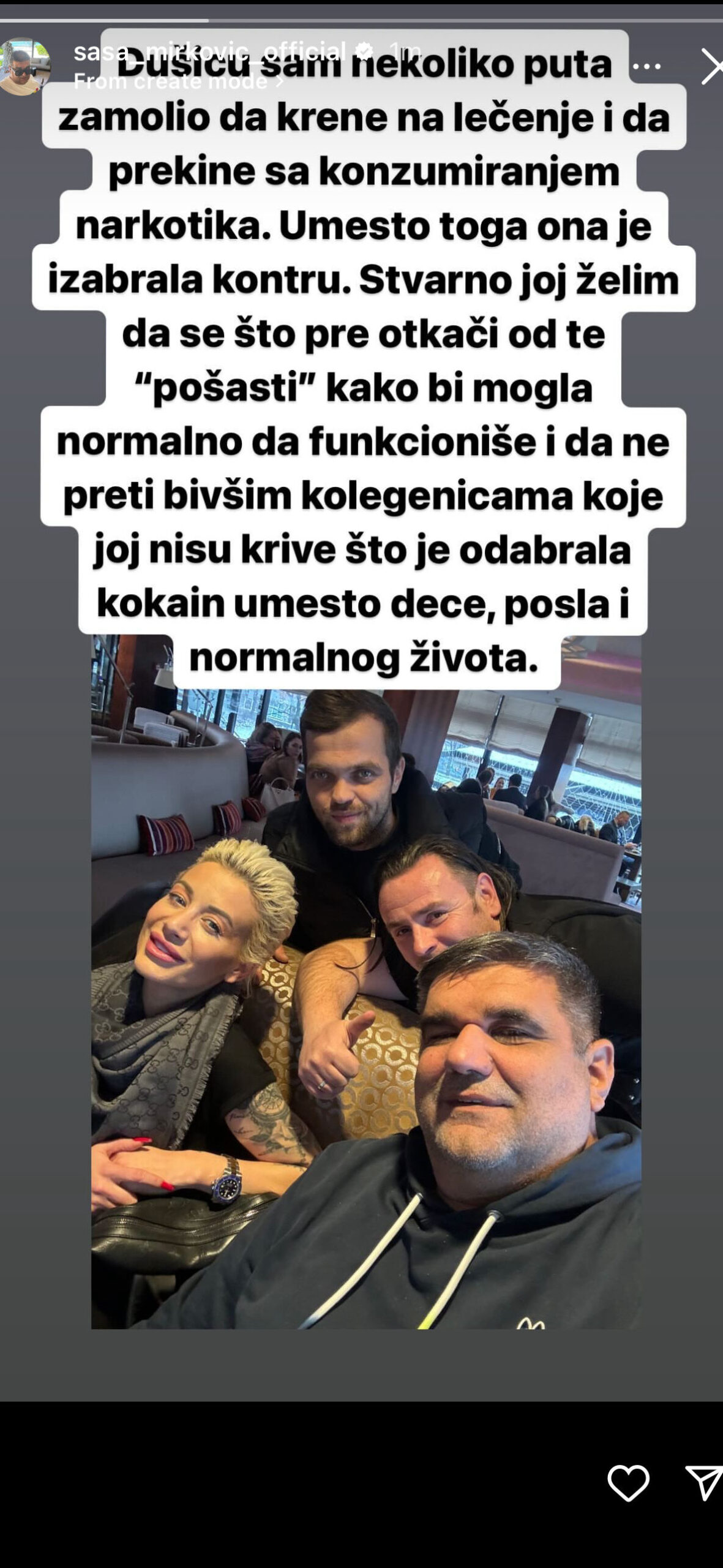 “Dušicu sam nekoliko puta zamolio da krene na lečenje i da prekine sa konzumiranjem narkotika. Umesto toga ona je izabrala kontru. Stvarno joj želim da se sto pre otkači od te „pošasti“ kako bi mogla normalno da funkcioniše i da ne preti bivšim kolegenicama koje joj nisu krive sto je odabrala kokain umesto dece, posla i normalnog života.” napisao je Mirković u dobroj nameri kao što je podsetimo pružio podršku Dušici kada je govorila da je prethodni poslodavac uskratio krov nad glavom i hleb njenoj deci.