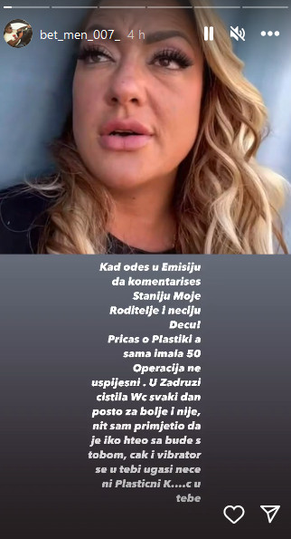 – Kada odeš u emisiju da komentarišeš Staniju, moje roditelje i nečiju decu.Pričaš o plastici a sama imala 50 operacija neuspešnih. U Zadruzi čistila WC svaki dan, pošto za bolje i nije. Niti sam primetio da je iko hteo da bude sa tobom, čak i vib**tor se ugasi u tebi – napisao je Asmin i dodao: