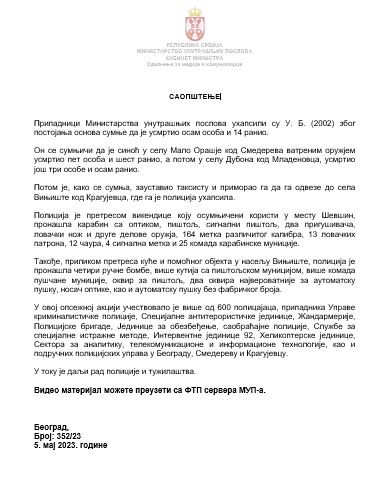Pripadnici Ministarstva unutrašnjih poslova uhapsili su U. B. (2002) zbog postojanja osnova sumnje da je usmrtio osam osoba i 14 ranio.
