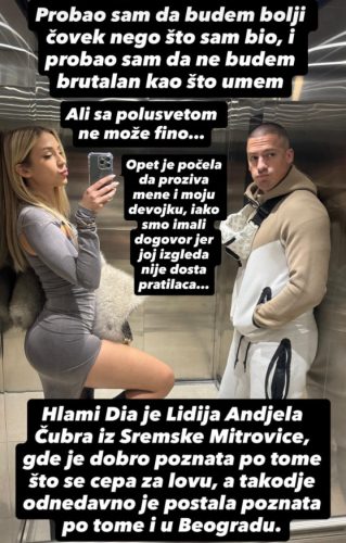 – Probao sam da budem bolji čovek nego što sam bio. I probao sam da ne budem brutalan kao što umem, ali sa polusvetom ne može fino. Opet je počela da proziva mene i moju devojku, iako smo imali dogovor, jer joj izgleda nije dosta pratilaca. Hlami Dia je Lidija Anđela Čubra iz Sremske Mitrovice, gde je dobro poznata po tome što se cepa za lovu, a takođe odnedavno je postala poznata po tome i u Beogradu – rekao je on.