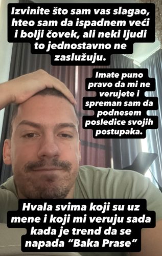 – Izvinite što sam vas slagao, hteo sam da ispadnem veći i bolji čovek, ali neki ljudi to jednostavno ne zaslužuju. Imate puno pravo da mi ne verujete i sprema sam da podnesem posledice svojih postupaka. Hvala svima koji su uz mene i koji mi veruju sada kada je trend da se napada „Baka Prase“ – napisao je Baka Prase.