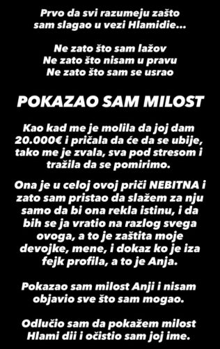 – Prvo da svi razumeju zašto sam slagao u vezi Hlami Die. Ne zato što sam lažov, ne zato što nisam upravu ili sam se usr*o. POKAZAO SAM MILOST. Kao kada me je molila da joj dam 20.000 evra i pričala da će da se ubije, tako me je zvala, sva pod stresom i tražila da se pomirimo. Ona je u celoj ovoj priči NEBITNA i zato što sam pristao da slažem za nju samo da bi ona rekla istinu. I da bih se ja vratio na razlog svega ovoga, a to je zaštita moje devojke, mene i dokaz ko je iza fejk profila, a to je Anja. Pokazao sam milost Anji i nisam objavio sve što sam mogao. Odlučio sam pokažem milost Hlami Diji i očistio sam joj ime. – rekao je on.